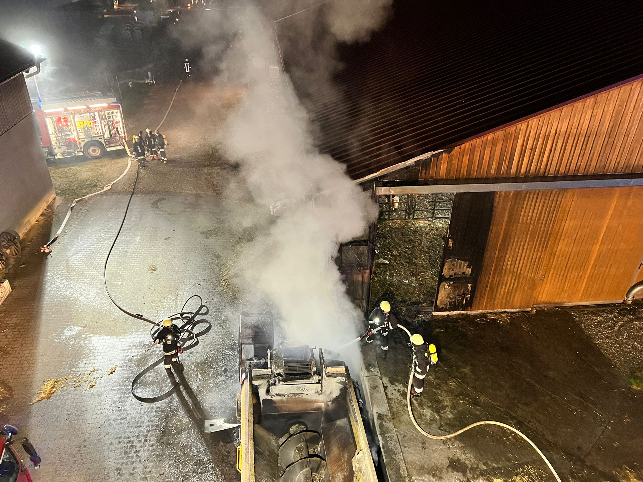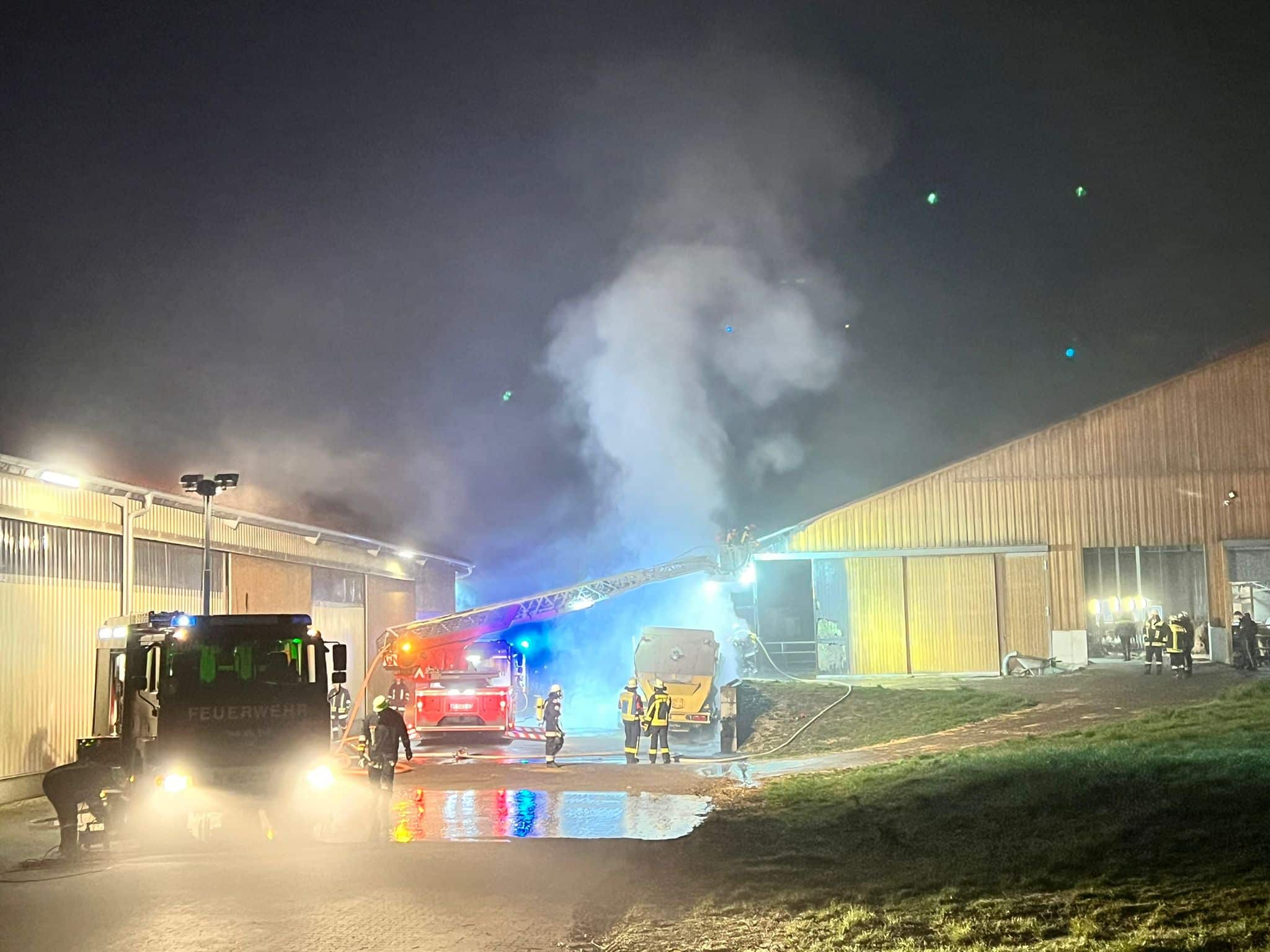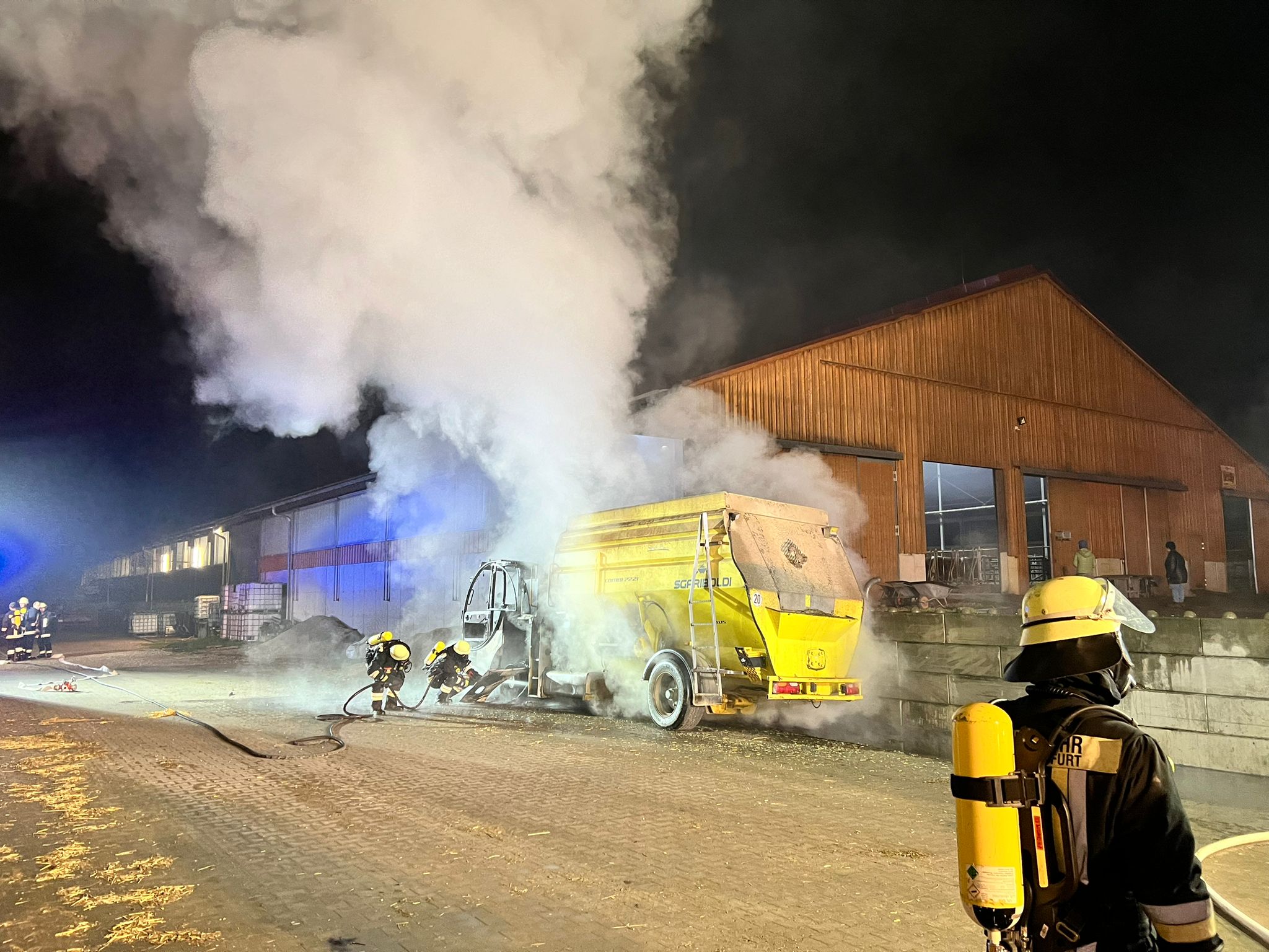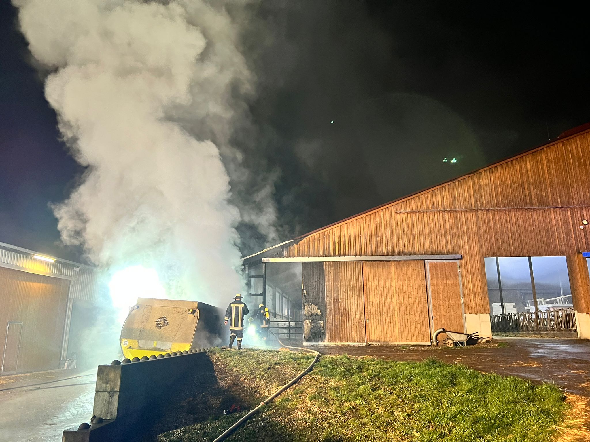 In der Nacht auf Donnerstag wurden mehrere Feuerwehren der Umgebung nach Ottmaring zu einem Brand eines Futtermischwagens gerufen, der auf den Kuhlstall überzugreifen drohte.