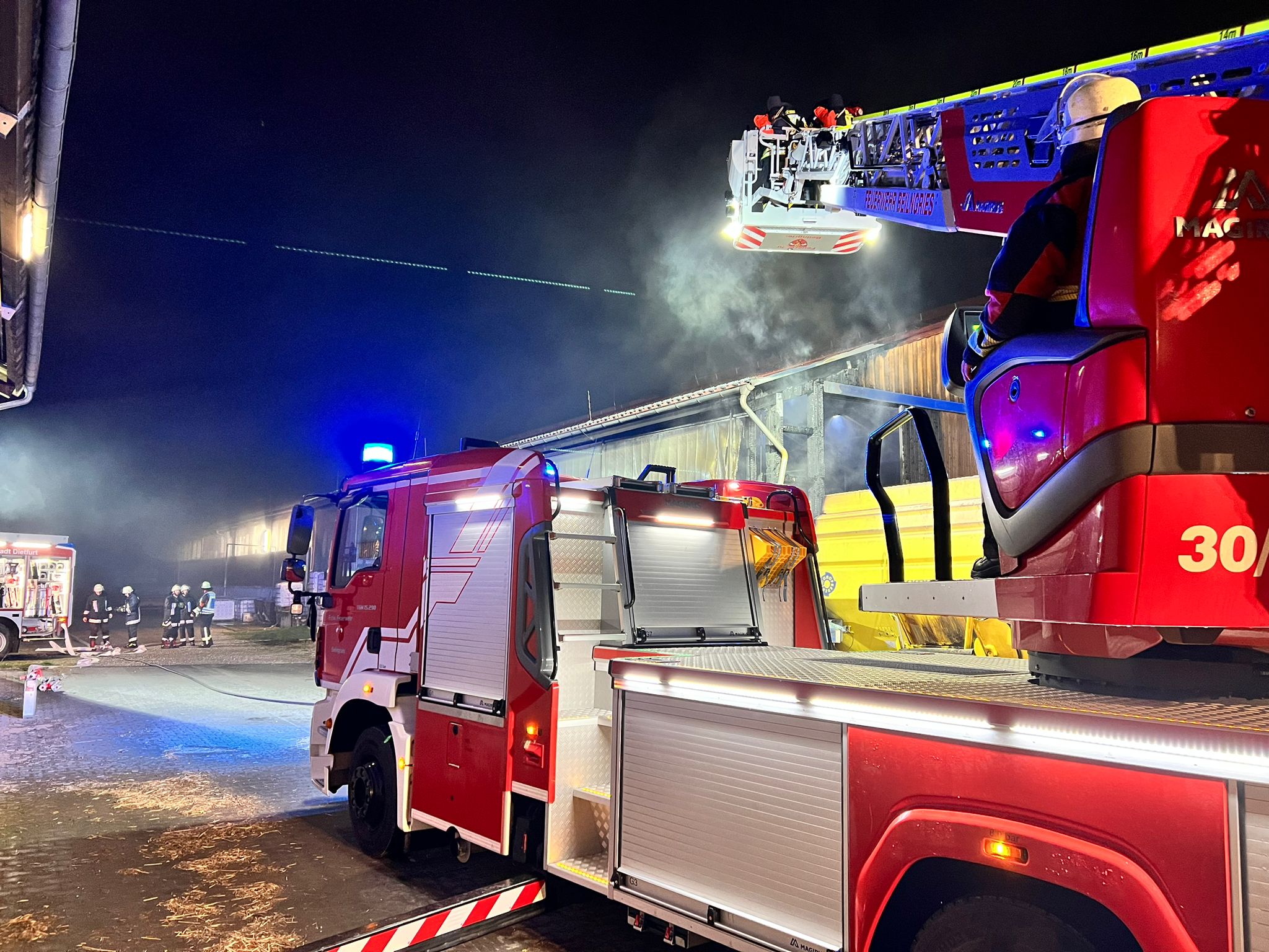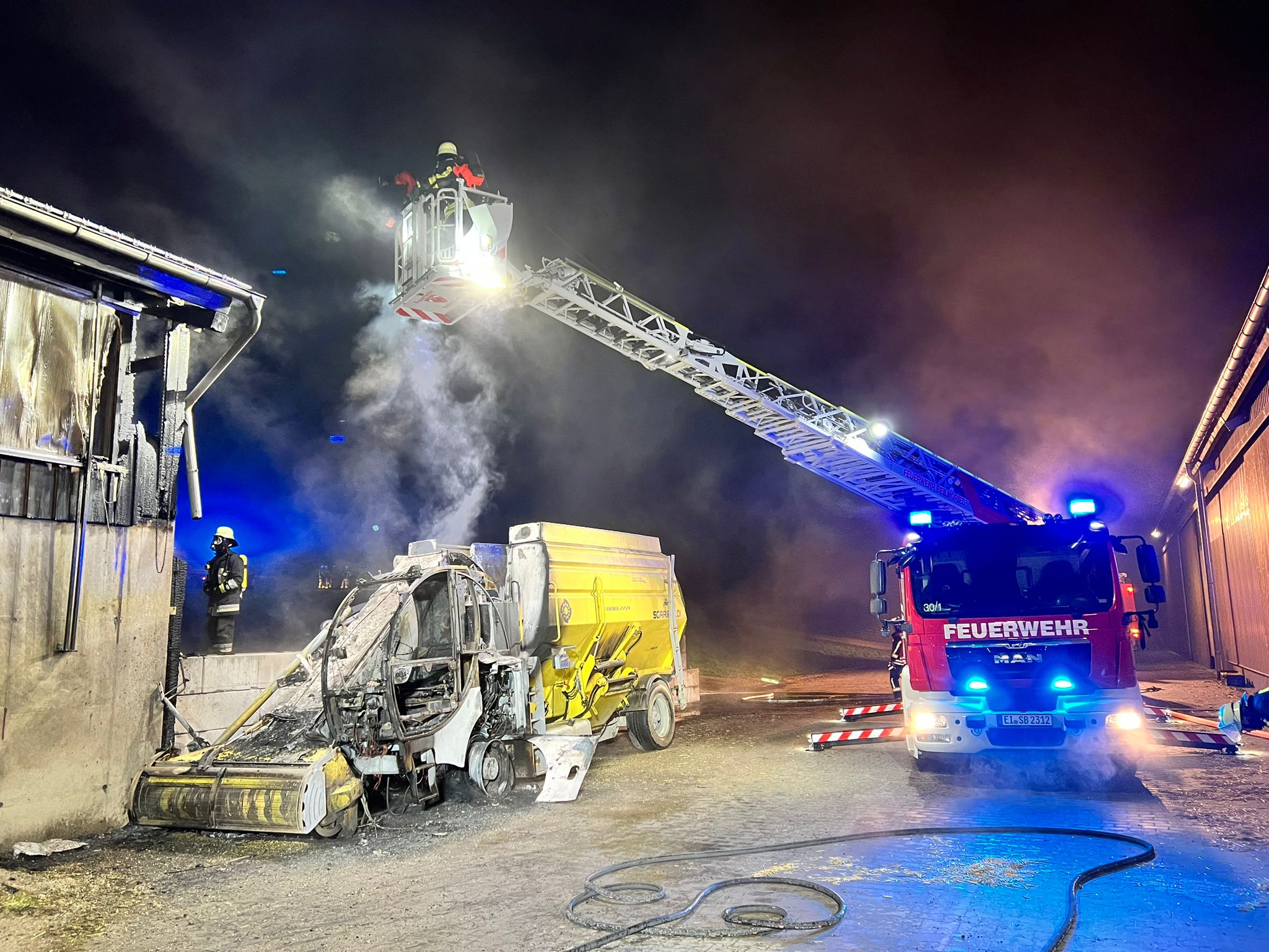 Dieses Lagebild bestätigte sich an der Einsatzstelle, das Feuer war bereits teilweise auf das Dach des Stalles übergegriffen. Unter dem Einsatz zweier Trupps unter schwerem Atemschutz konnte eine weitere Ausbreitung glücklicherweise verhindert werden. Die Kameraden aus Beilngries unterstützten uns bei der anschließenden Kontrolle des Daches von außen mit der Drehleiter, indem sie die verbleibenden Glutnester ablöschten. Abschließend konzentrierten sich die Nachlöscharbeiten auf den Futtermischwagen, welcher weiter gekühlt wurde. Austretende Betriebsstoffe wurden gebunden.