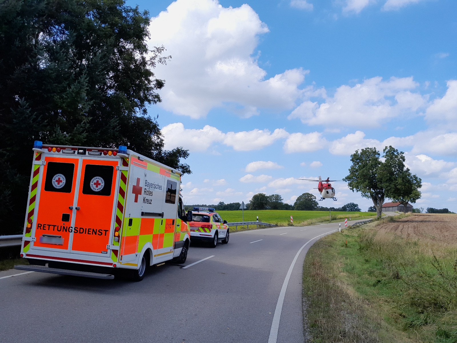 Die Betreuung der verunfallten Fahrerin wurde vom Helfer vor Ort und Rettungsdienst übernommen. Wir übernahmen die Absicherung der Einsatzstelle und des Landeplatzes für den Rettungshubschrauber und banden auslaufende Betriebsmittel.