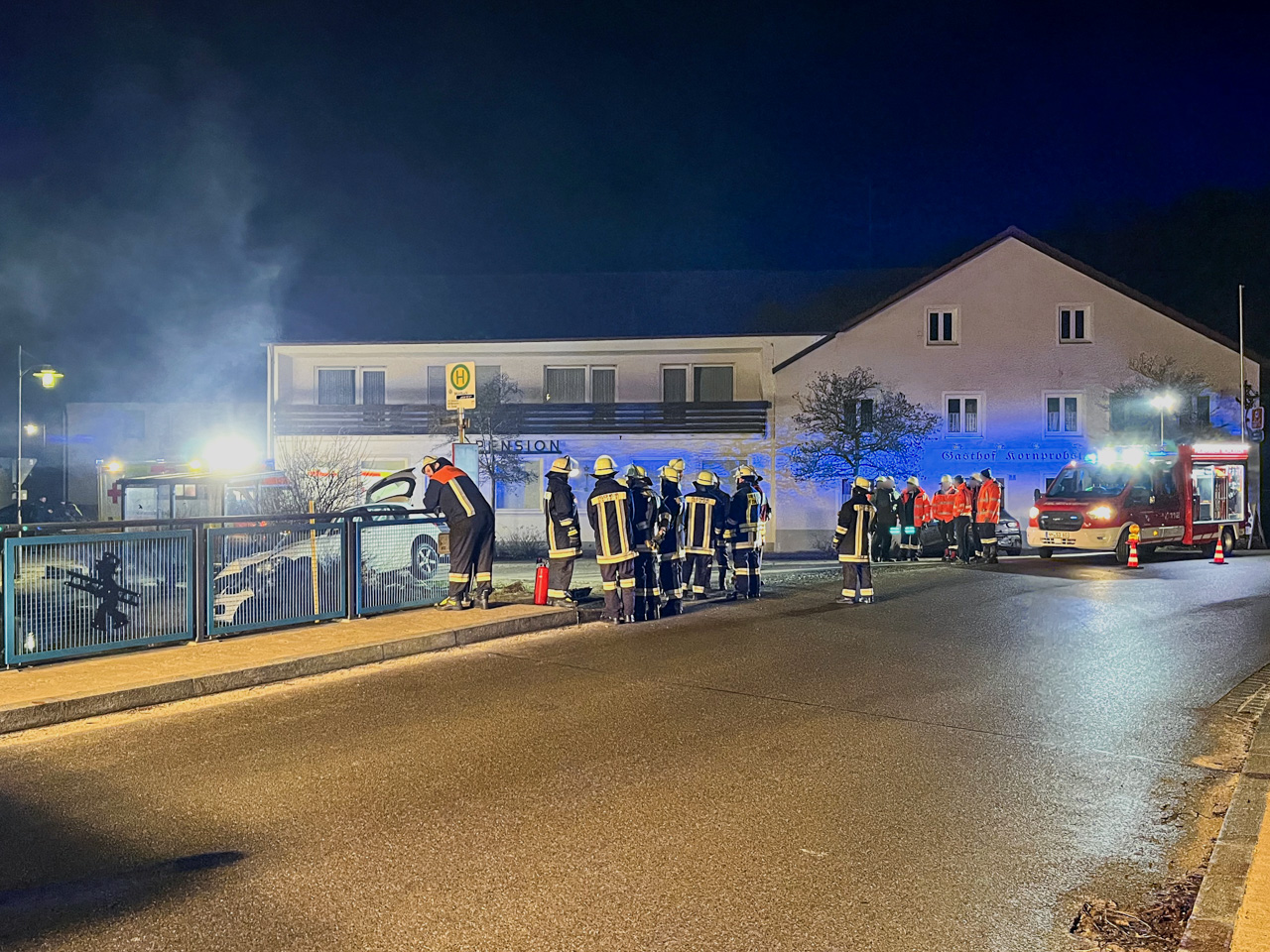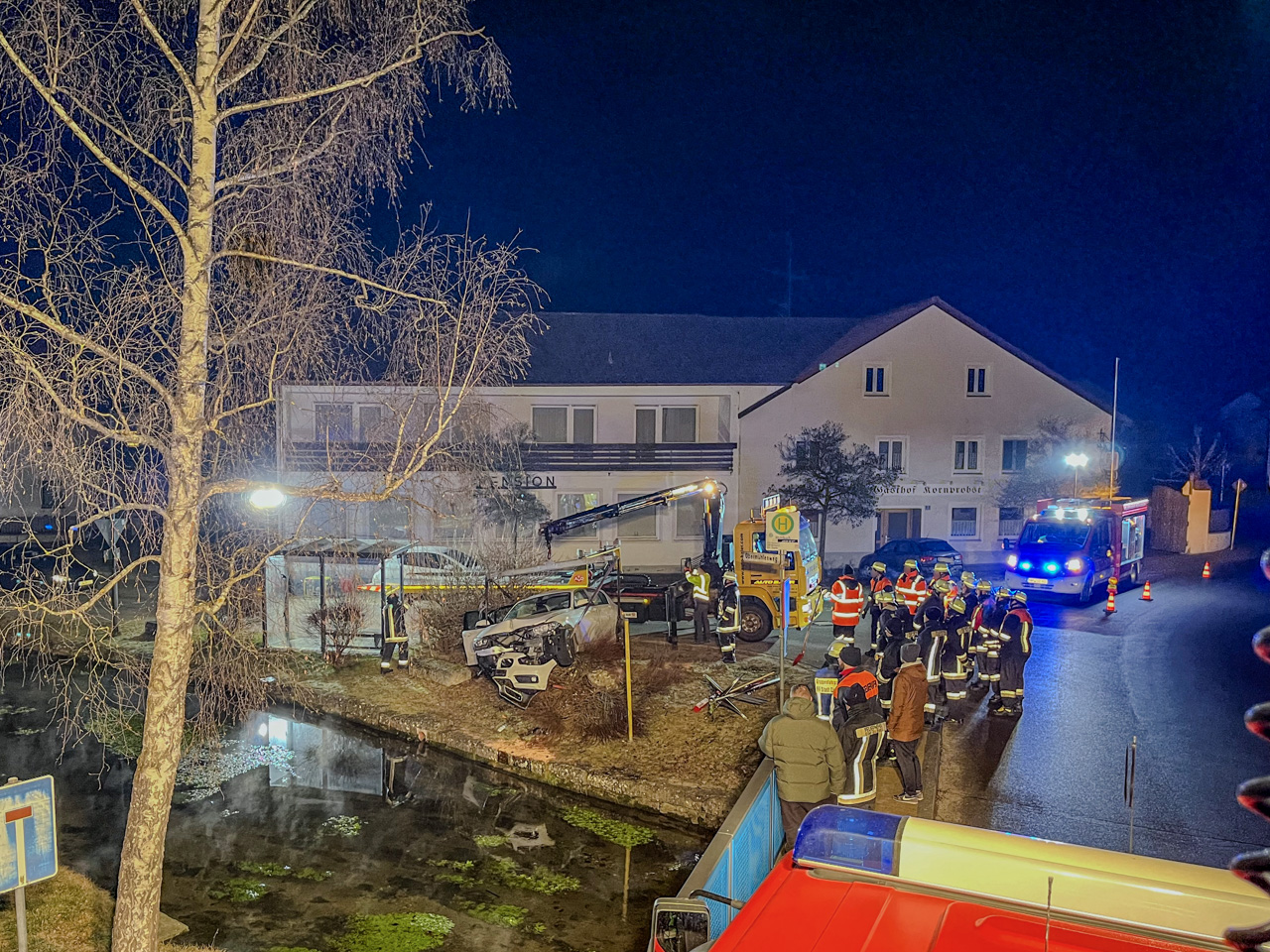 Ein PKW war innerorts von der Fahrbahn abgekommen und befand sich mit dem Frontbereich im Mühlbach. Ein Kamerad der Feuerwehr Mühlbach reagierte unverzüglich und zog den beschädigten PKW mit einem Traktor aus dem Bach, um eine größere Verschmutzung des Gewässers zu verhindern. Bei unserem Eintreffen wurden die beiden verletzten Personen bereits von Anwohnern und anschließend vom Rettungsdienst betreut. Neben dem Abklemmen der Batterie und dem Sicherstellen des Brandschutzes wurde eine Ölschlinge mit Ölbindevliese errichtet, um das ausgetretene Öl zu binden. Nach der Unterstützung beim Abtransport des Fahrzeugs durch ein Abschleppunternehmen war der Einsatz für uns beendet.